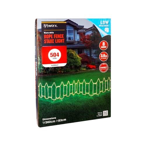 Provide elegant ambient lighting and illuminate pathways, gardens, yards, and any outdoor space with Lytworx Warm White LED Rope Fence Stake Light. Charmingly crafted and designed to resemble fencing, this light set contains 504 warm white LED bulbs and measures a 3.6m in length